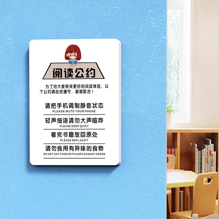 阅读公约自习室图书馆室保持安静请将阅读完的书籍放回原处摆放温馨提示牌贴纸学校书吧个性创意标识门牌定制