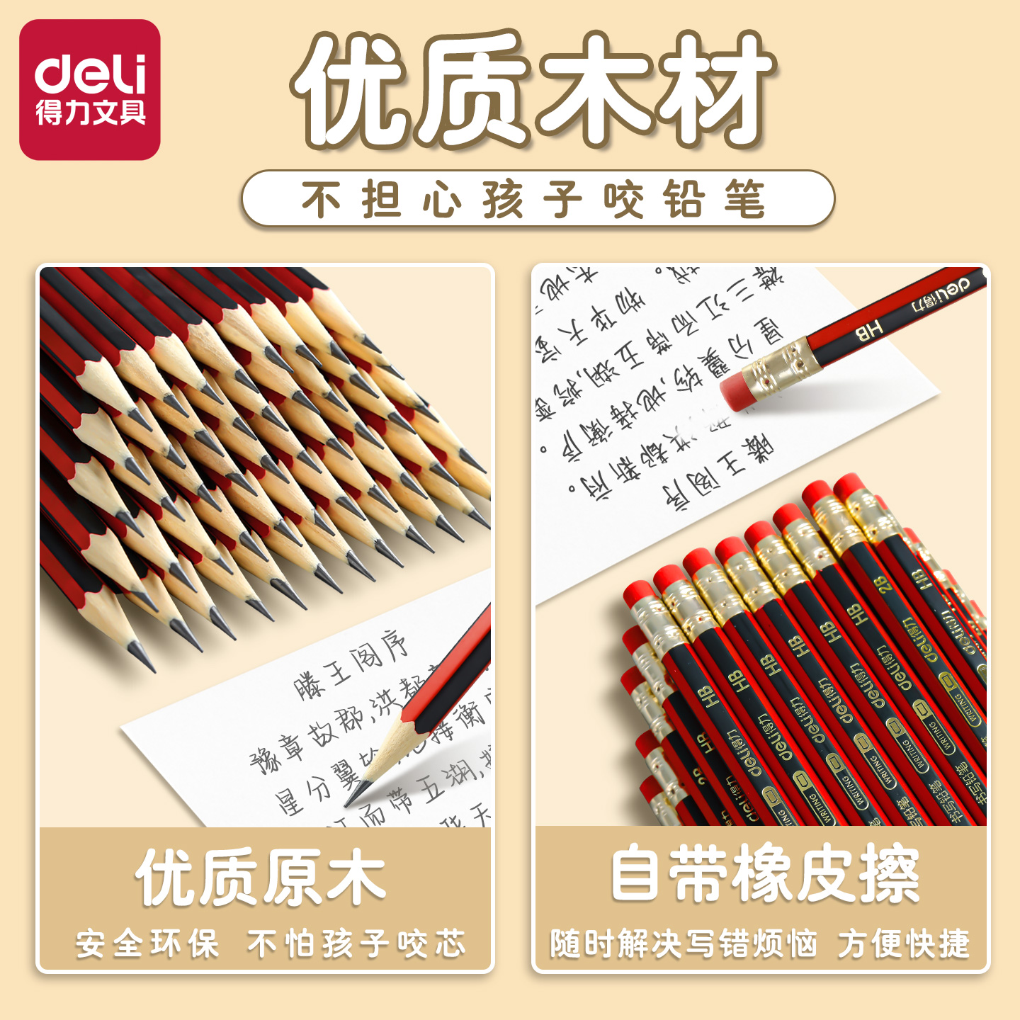 得力铅笔小学生一年级带橡皮儿童hb幼儿园初学者2B原木考试专用