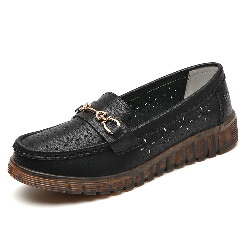 双星真皮牛筋底中年妈妈鞋女镂空小皮鞋大码软底一脚蹬懒人豆豆鞋