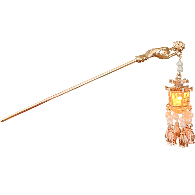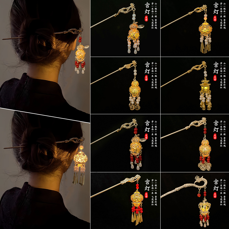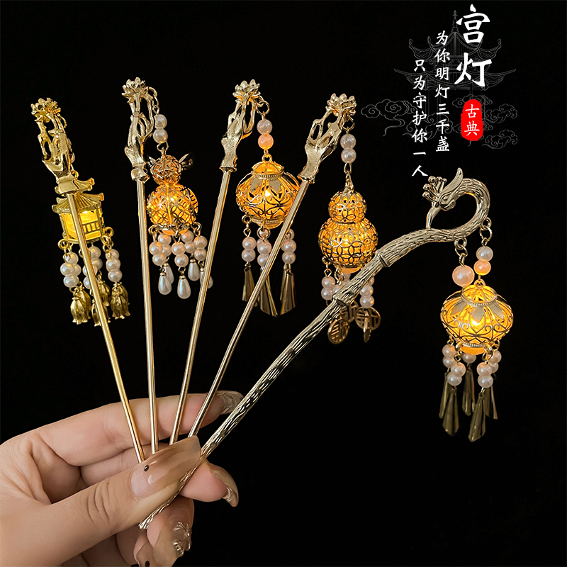 高级感古风发簪女款发光步摇发钗发饰金色宫灯后脑勺头簪簪子流苏