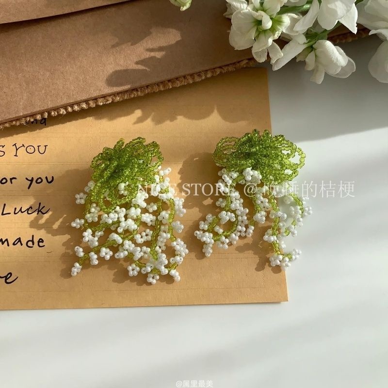 晚睡的桔梗「茉莉丛」法式田园风车茉莉串珠耳环流苏森系清新耳饰