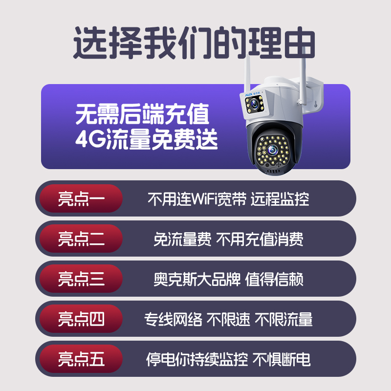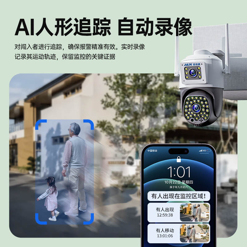 奥克斯无线摄像头4G无需网络手机远程家用室内免插电360度监控器