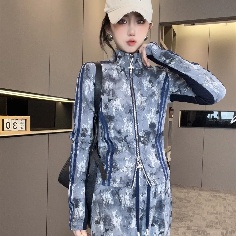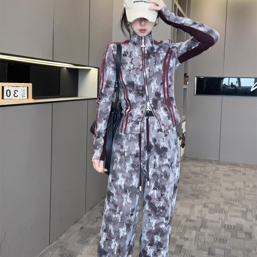 网红韩版炸街套装时尚时髦复古迷彩牛仔休闲洋气哈伦裤两件套女装
