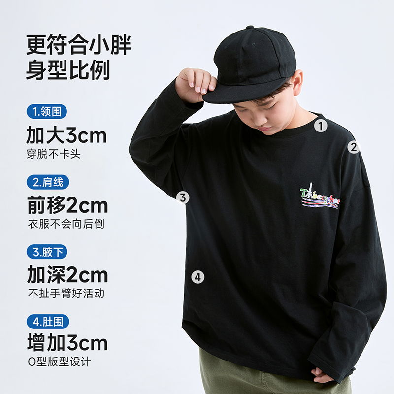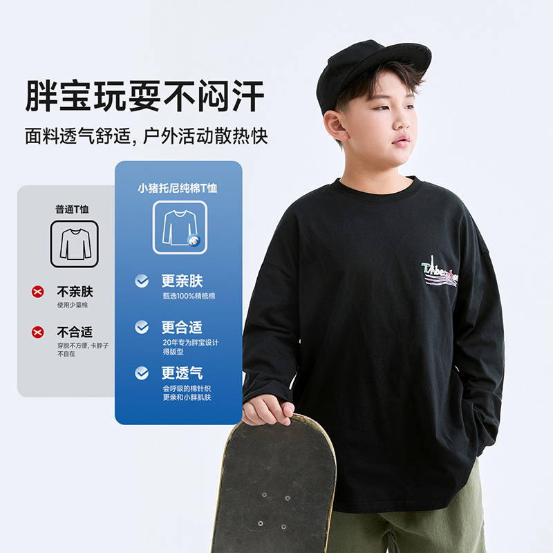 小猪托尼胖男童T恤长袖秋纯棉t青少年百搭上衣胖童装男童加肥加大