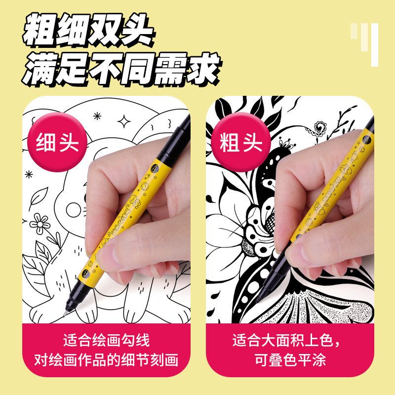 双头记号笔勾线笔美术专用小学生绘画黑色油性粗细两头儿童幼儿园马克笔描边速干防水防油不掉色工地划线