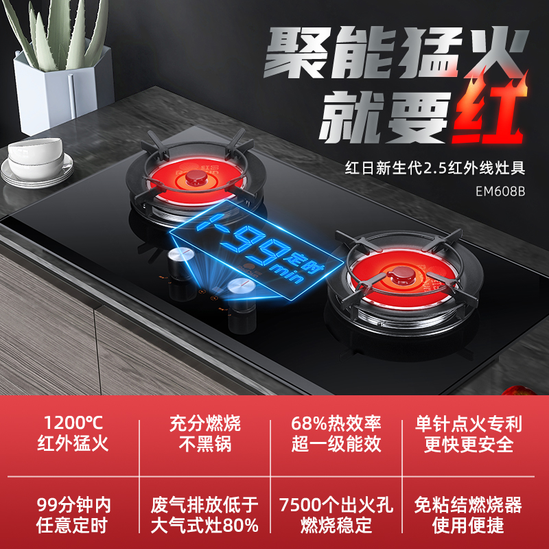 红日红外线燃气灶双灶家用高热效智能定时灶防干烧双灶EM608B/BP