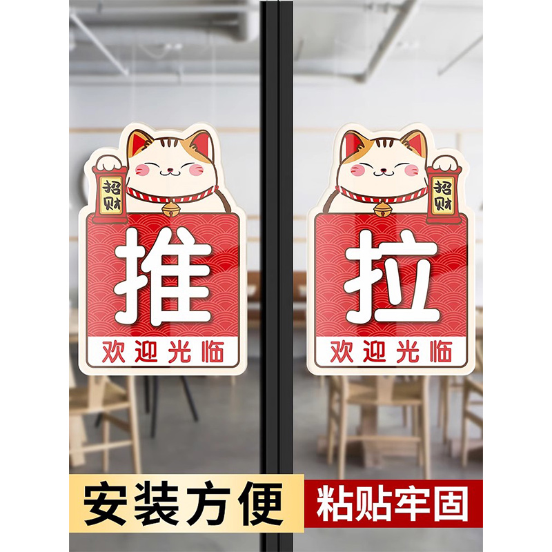 亚克力推拉门贴温馨提示牌定制左右移门门牌玻璃门门上拉字标识牌店铺门口开门提醒贴纸推门标志指示标牌定做