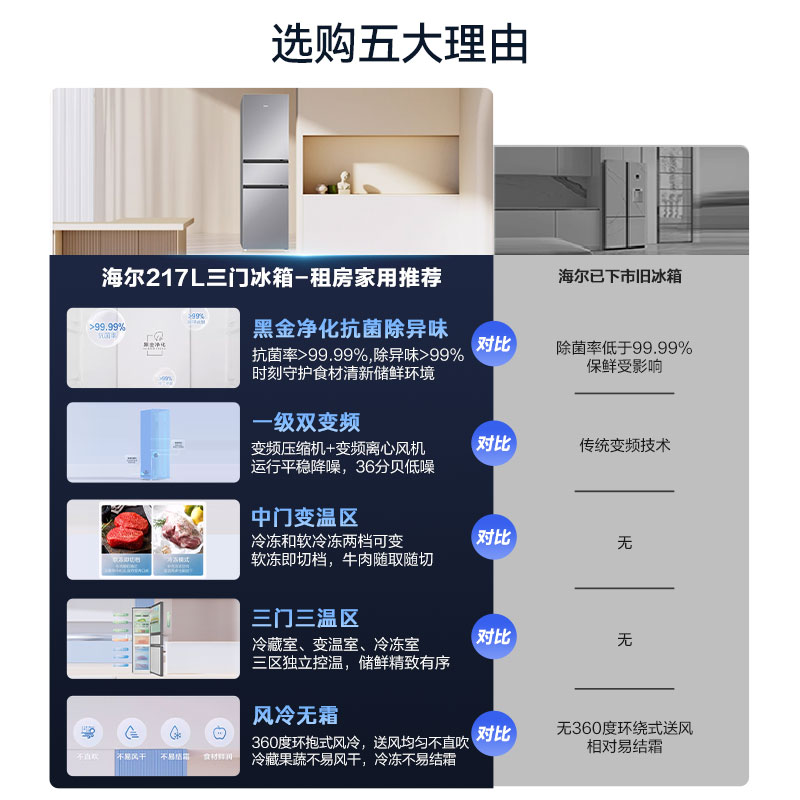 海尔冰箱以旧换新补贴217L风冷无霜变频小冰箱家用一级能效官方