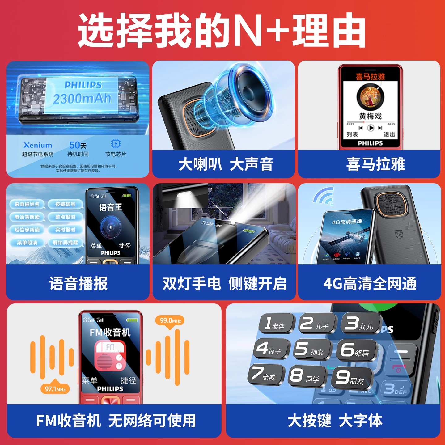 [官方旗舰店]飞利浦2025年新款老年机全网通4G正品超长待机老人机大屏大字大声音男女电信版学生手机按键机