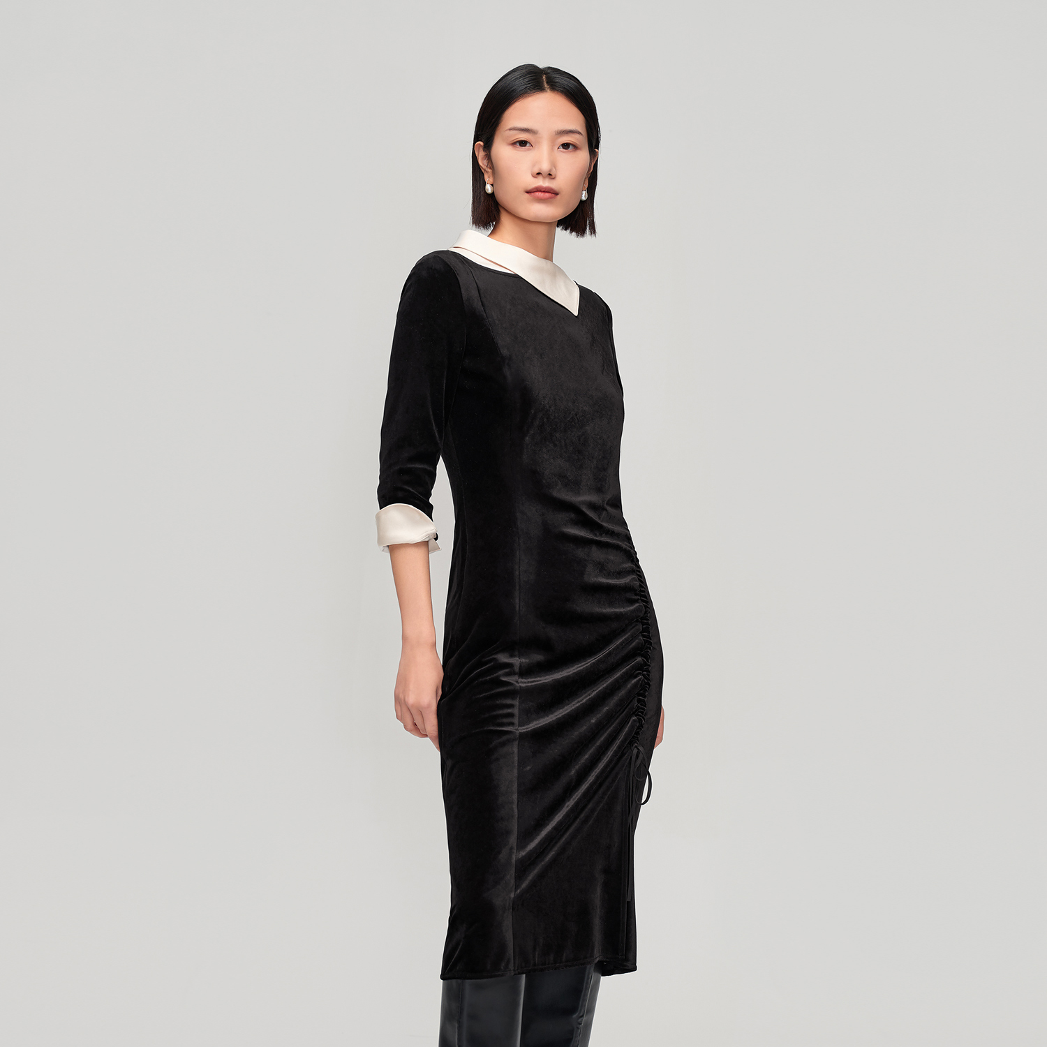 OVVOutlet秋冬新款女装醋酸丝绒单边抽绳设计六分袖长款连衣裙
