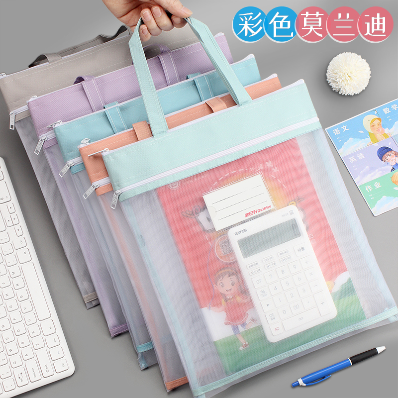 加大号透明网纱文件袋中小学生手提科目袋a4资料试卷学科分类袋双层拉链大容量补习课考试文具用品便携收纳袋