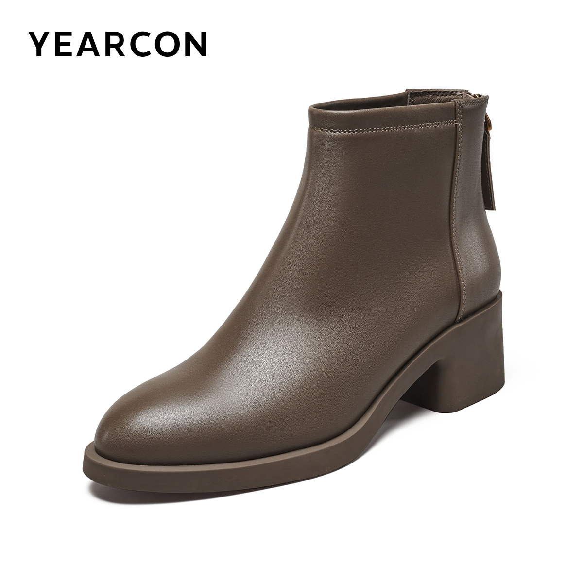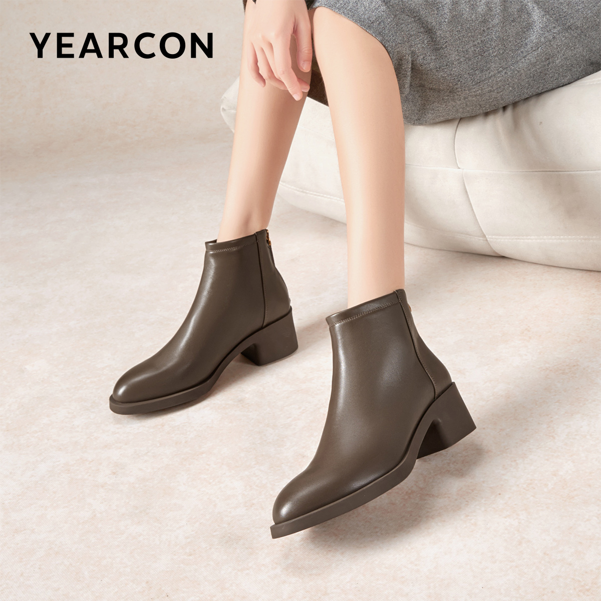 意尔康女鞋冬季真皮法式短靴粗跟通勤气质显瘦单靴及踝靴女士皮鞋