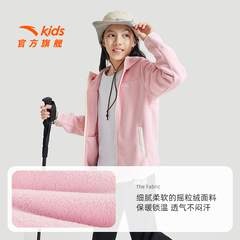 安踏儿童女童摇粒绒外套春秋新款抗静电连帽运动上衣保暖加绒小童