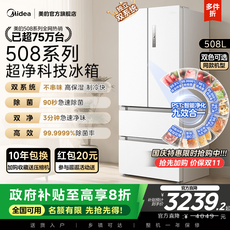 美的508法式双系统多门净味四门双循环无霜一级大容量家用冰箱