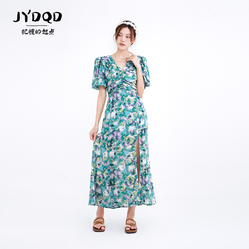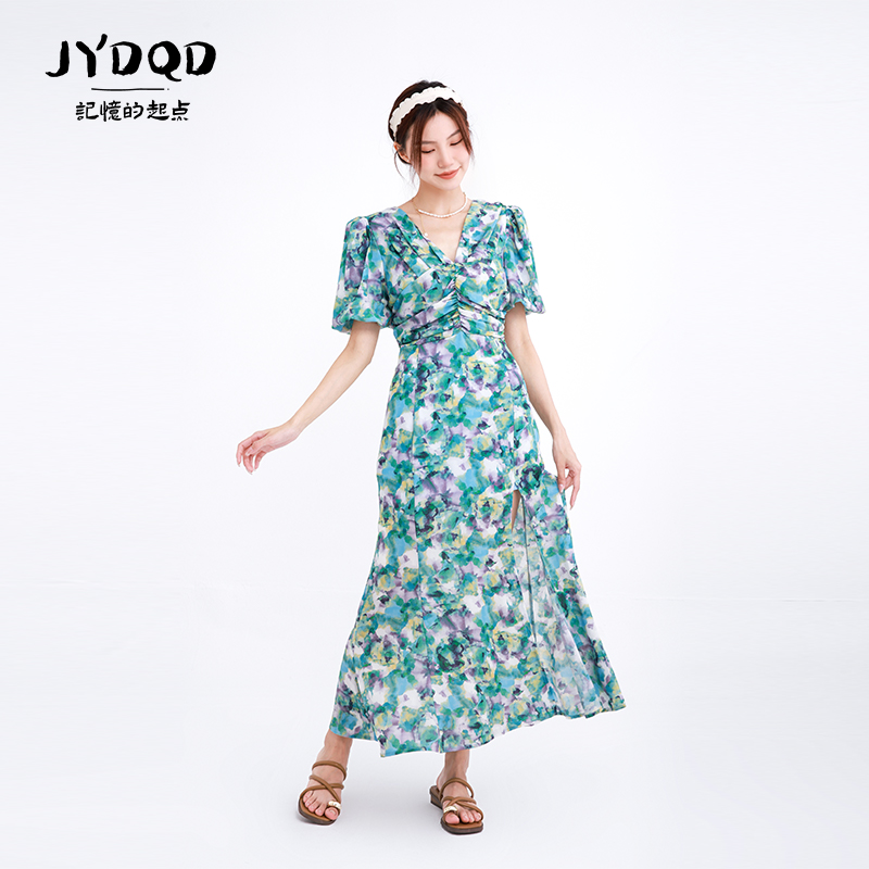 记忆的起点连衣裙2023夏法式V领度假风侧开叉收腰长裙潮67TX81507
