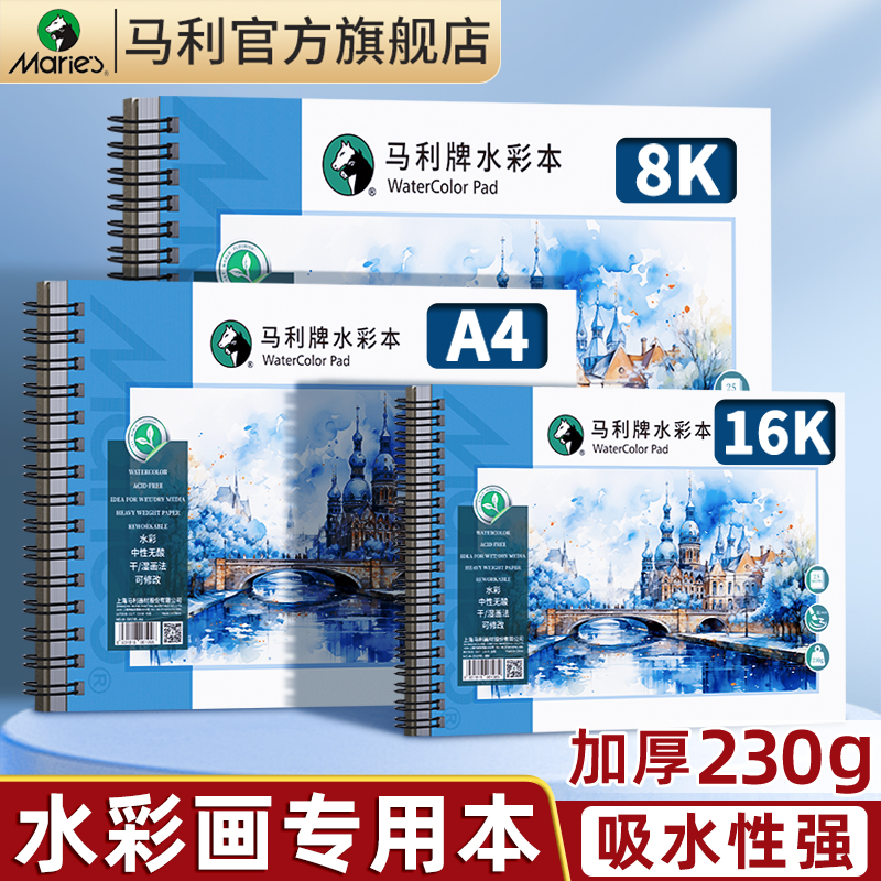 马利水彩本加厚8K水彩纸本水彩画纸手绘本水彩纸初学者16k水彩速写本随身便携写生本美术生专用涂鸦画画旅行