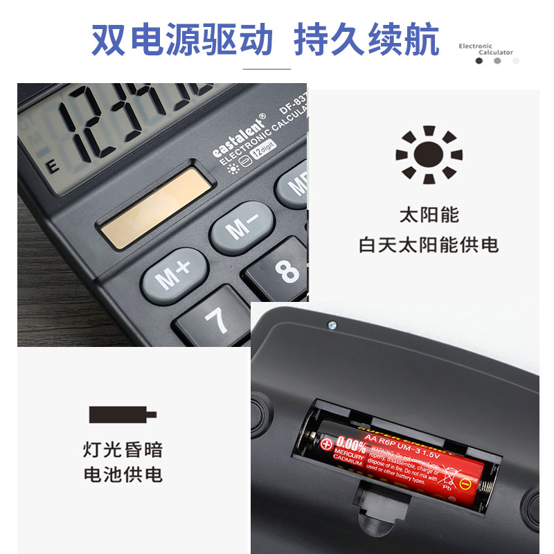东方灵太阳能12位学生金融计算器双电源带连加连减大号耐磨计算机