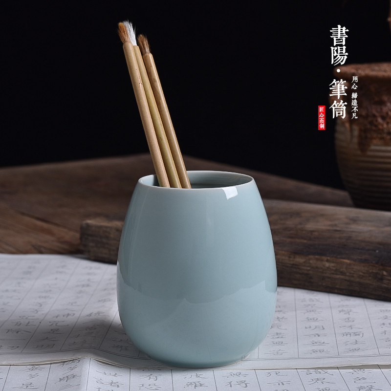 龙泉青瓷文房用具创意文具时尚圆形陶瓷精品多功鼓型办公笔筒包邮