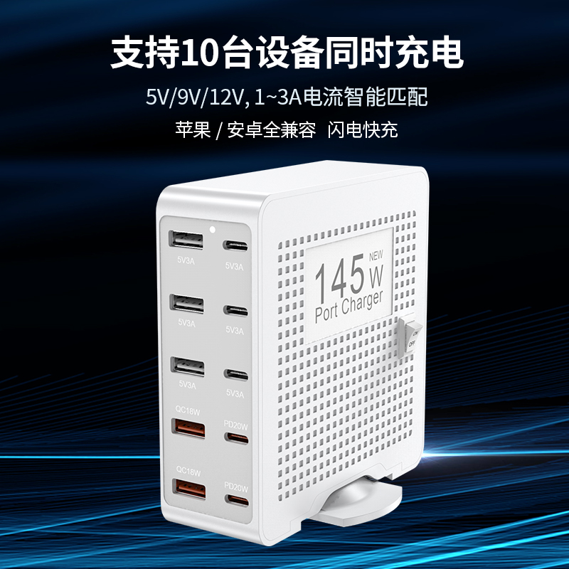 145w多口usb充电器QC3.0速充电头3a多口type-c充电头多pd快充头20W快充同时多口工作充电桩3a快速充电站2.4A