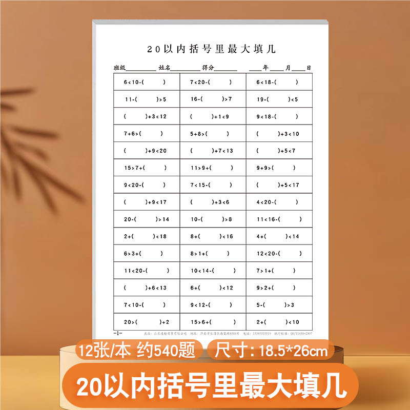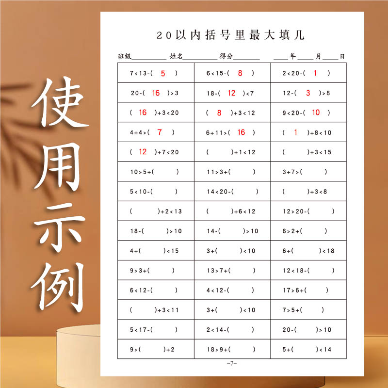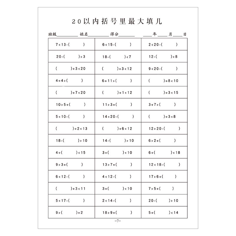 20以内括号里最大填几最小填几专项练习纸小学生一年级幼儿园中大班大于号小于号加减法20以内填数专项练习纸