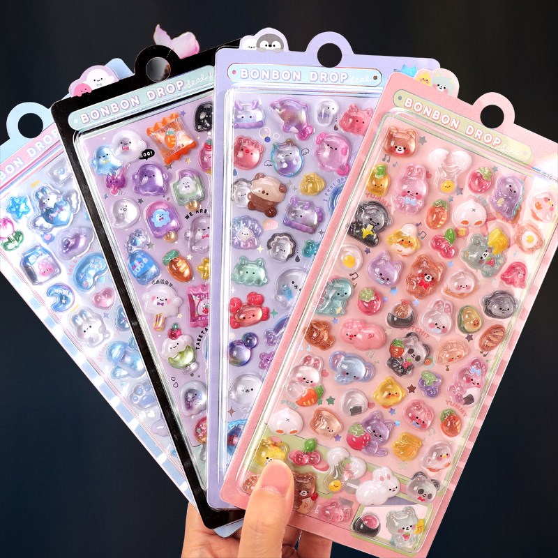 3D立体浮雕贴纸女孩儿童卡通动物宝石贴画钻石手机壳装饰水晶滴胶防水手帐高透明贴贴纸水杯手机后壳玩具家族