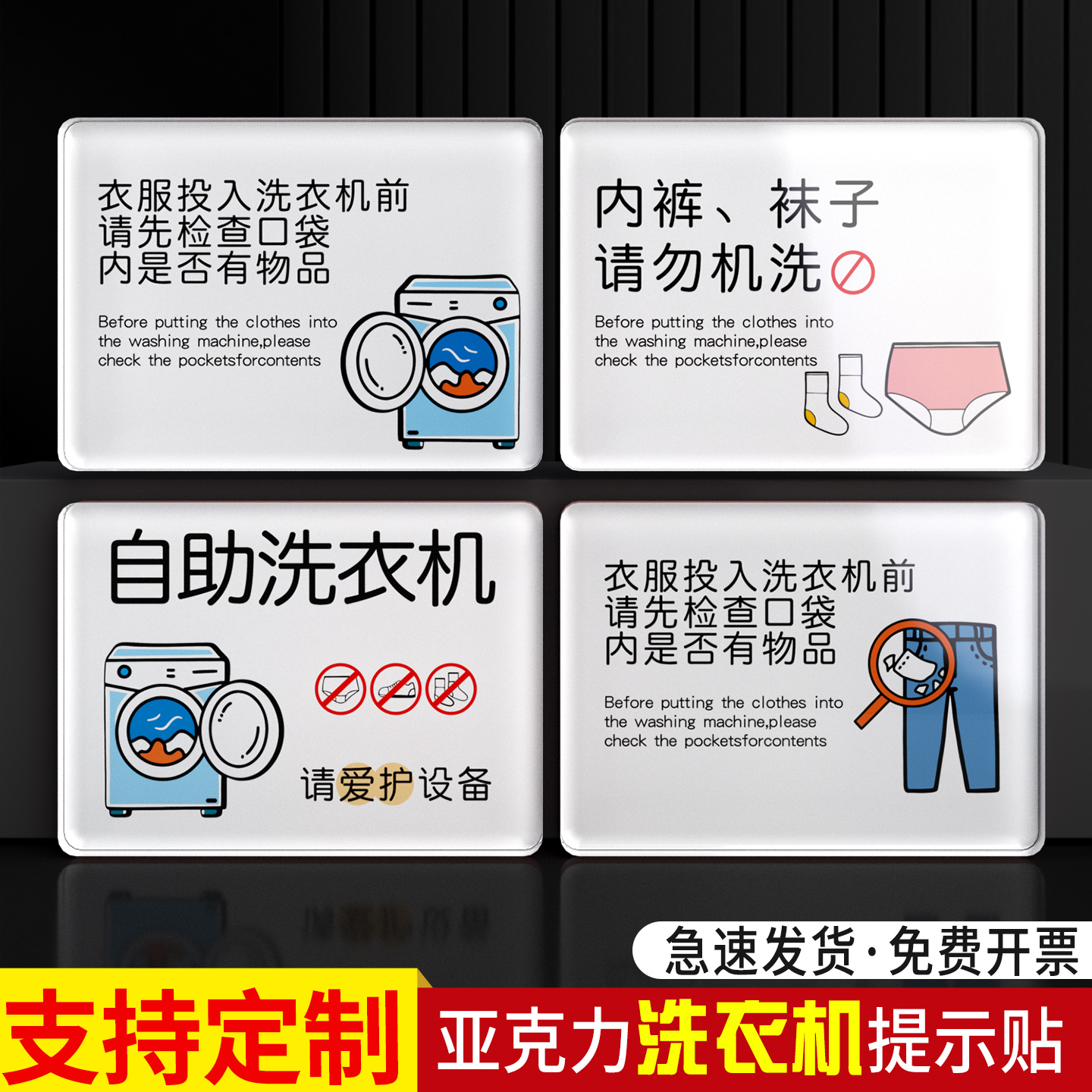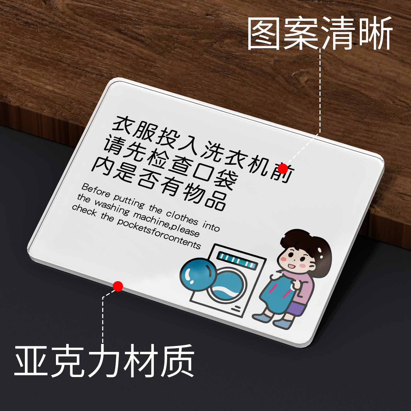 亚克力洗衣服前注意温馨事项请先检查口袋内是否有物品自助洗衣提示牌
