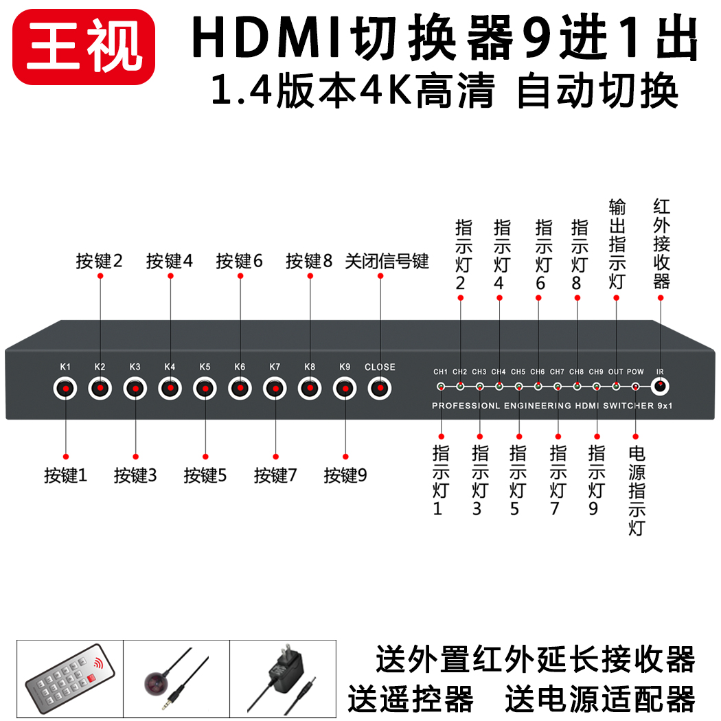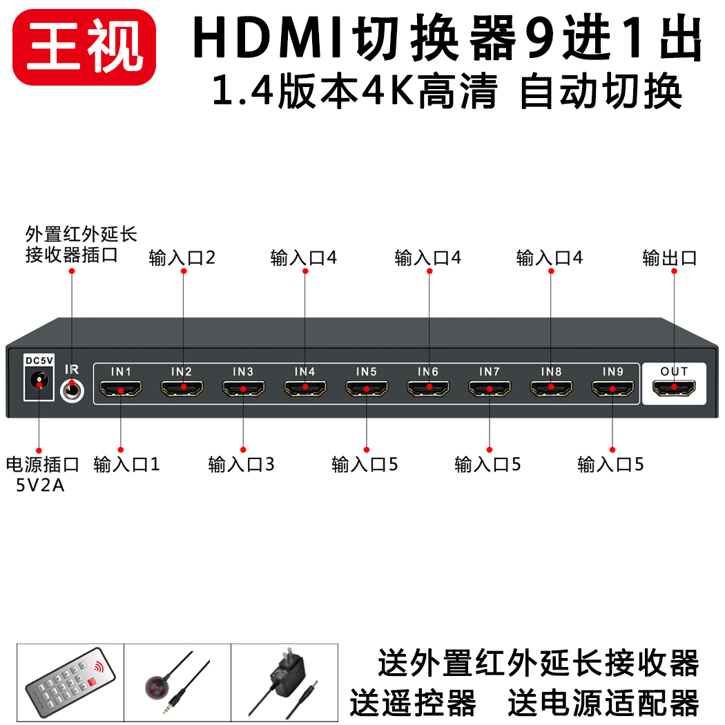 hdmi切换器9进1出8进1出八九进一出1.4版自动4K高清音视频电脑显示器笔记本屏幕通用全金属办公家用全