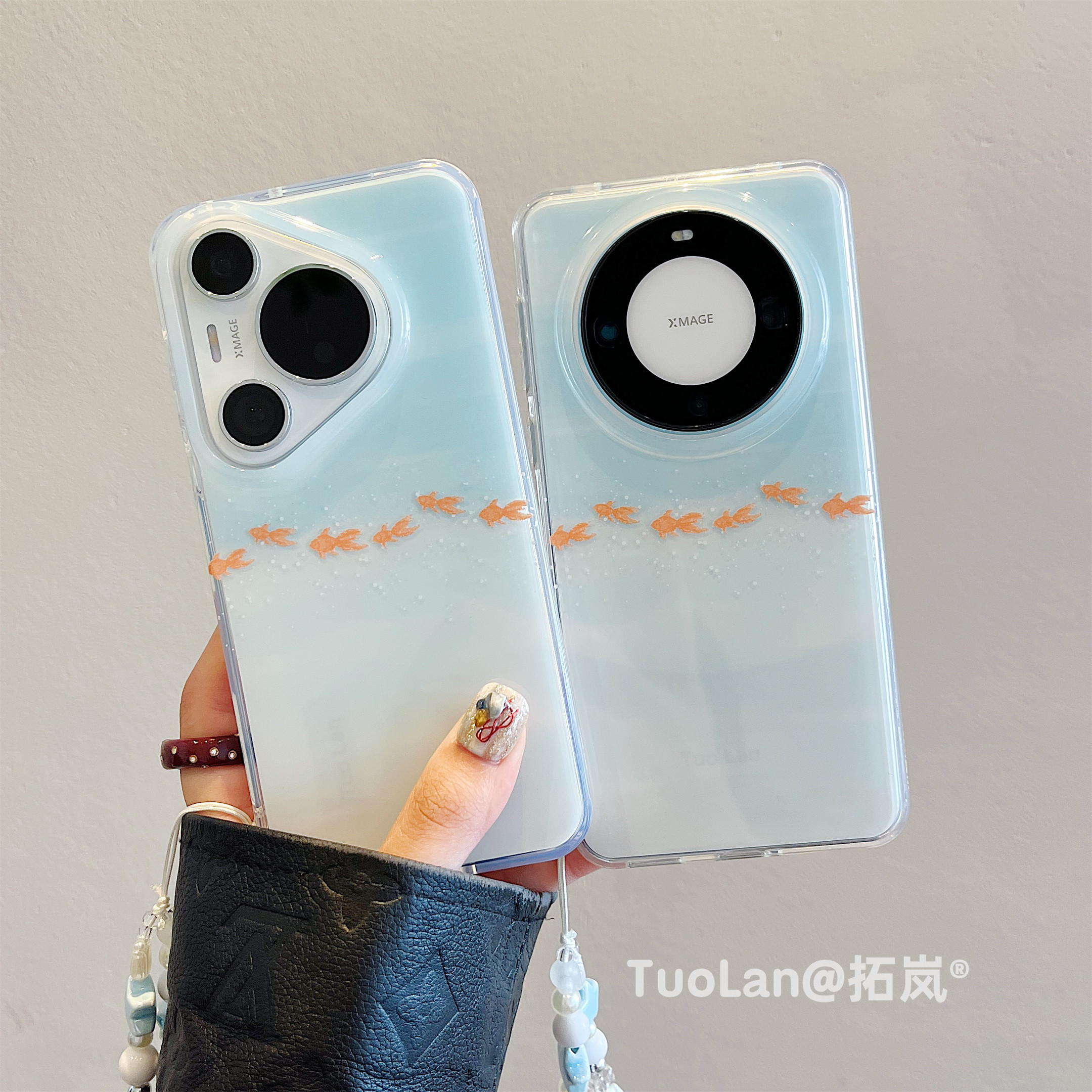 拓岚 适用华为mate60pro+手机壳网红新款双层渐变天蓝色好运锦鲤金鱼mate70pro挂绳pura70pro硅胶防摔保护女