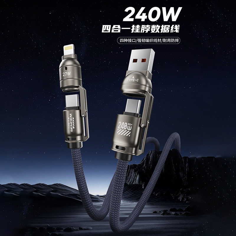 REMAX睿量1.5米手机挂绳数据线伸缩挂脖斜挎充电线四合一240W编织快充线C7