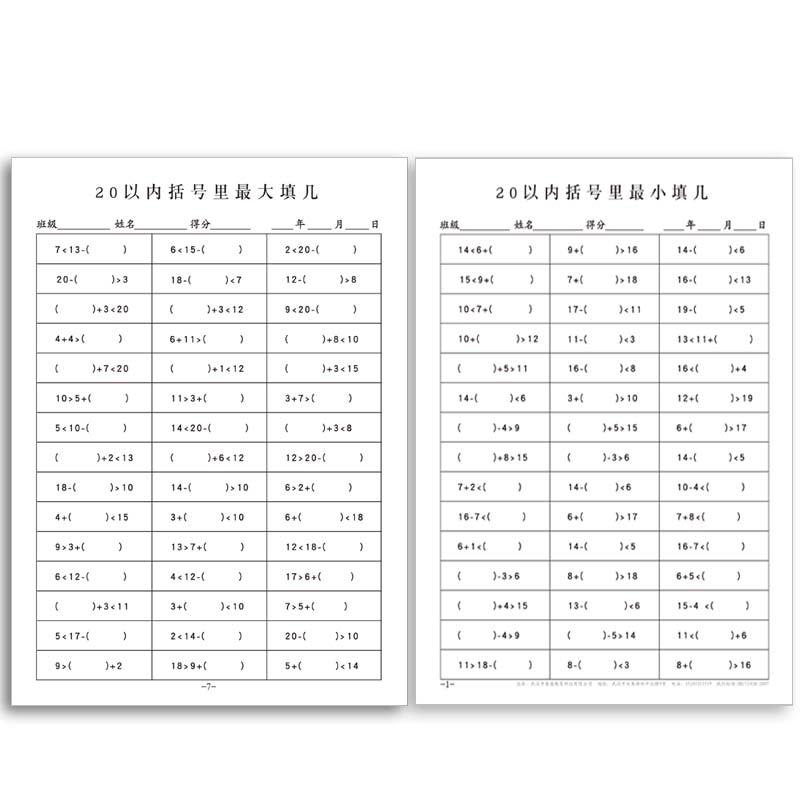 20以内括号里最大最小填几专项练习纸幼儿小学读数写数专项练习纸学前班幼儿园一年级大于号小于号加减法练习