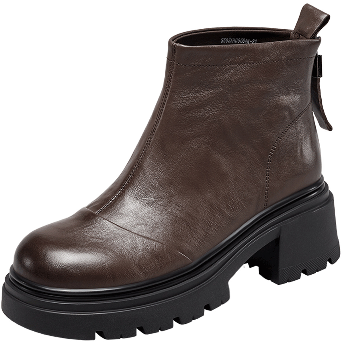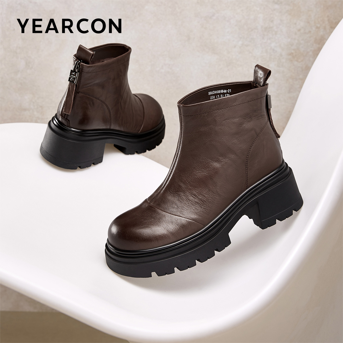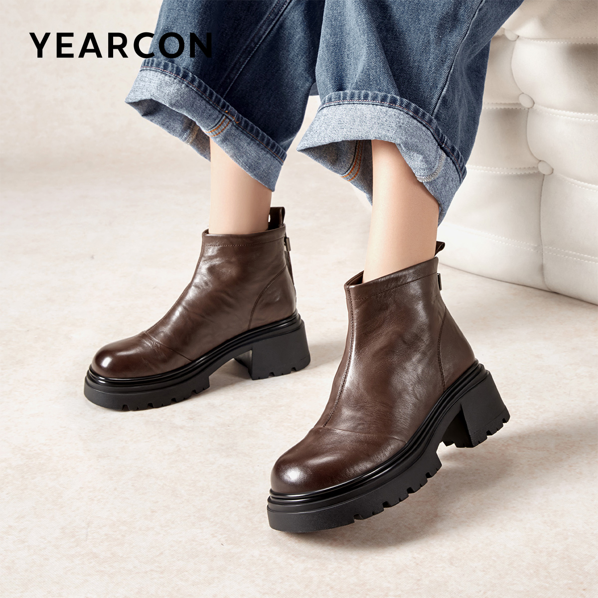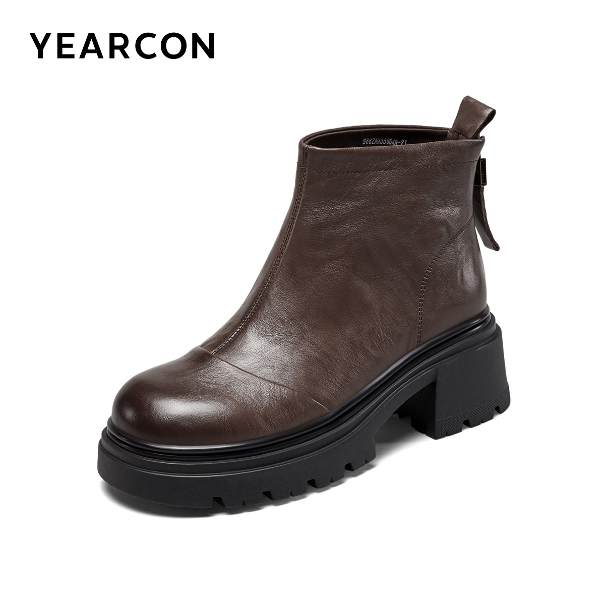 意尔康女鞋秋冬真皮短靴粗跟单靴气质英伦显瘦复古及踝靴女士皮鞋