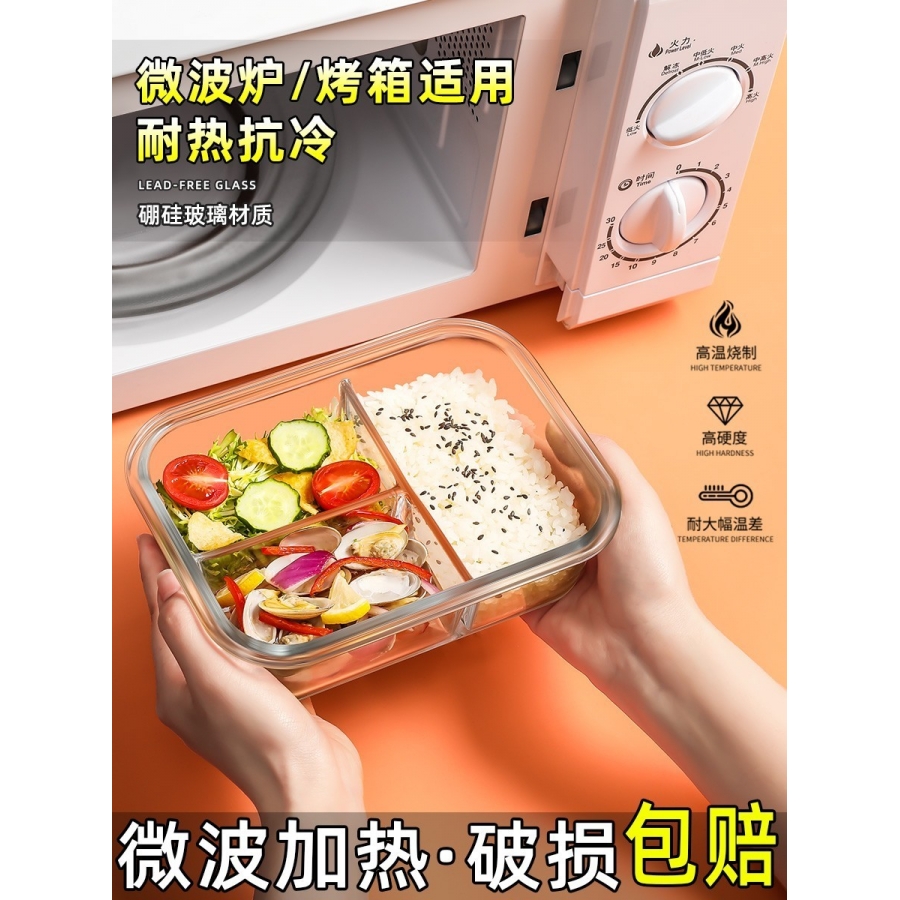玻璃饭盒可微波炉加热专用上班族带饭装汤餐碗保鲜分隔型便当带盖