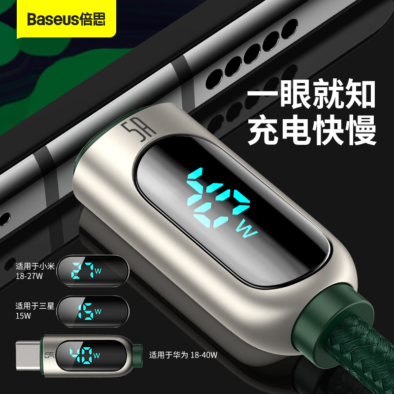 倍思数据线typec快充5A闪充适用于小米10Pro华为mate30荣耀V30三星S20+手机平板充电线带智能数显实时监测