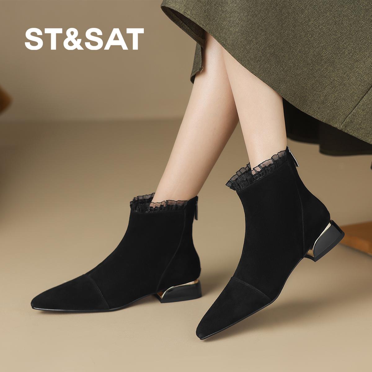 星期六羊反绒粗跟短筒女靴素面百搭通勤及踝靴优雅气质休闲靴子女