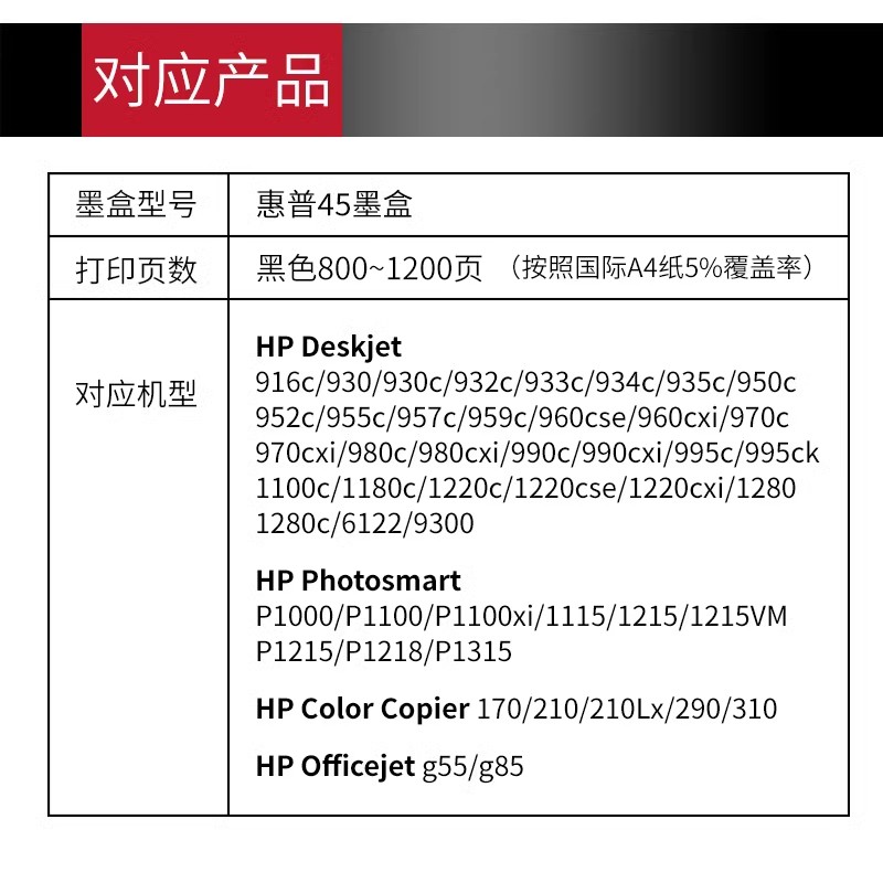 适用惠普45墨盒 CAD服装机绘图仪 唛架机 服装打版机 墨盒 HP1280 1180打印机 51645A墨盒 45油性墨水可加墨