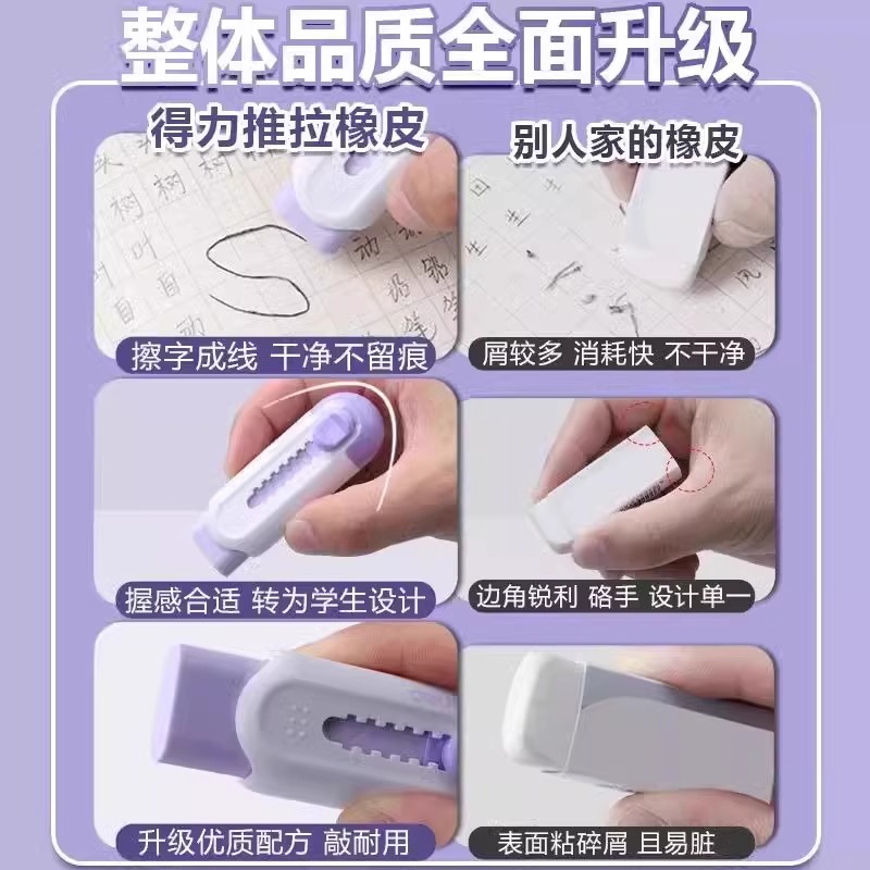 得力推拉橡皮擦小学生专用像皮擦不易留痕无屑超干净象皮擦幼儿园儿童推动式橡皮擦文具用品擦字成线安全无毒