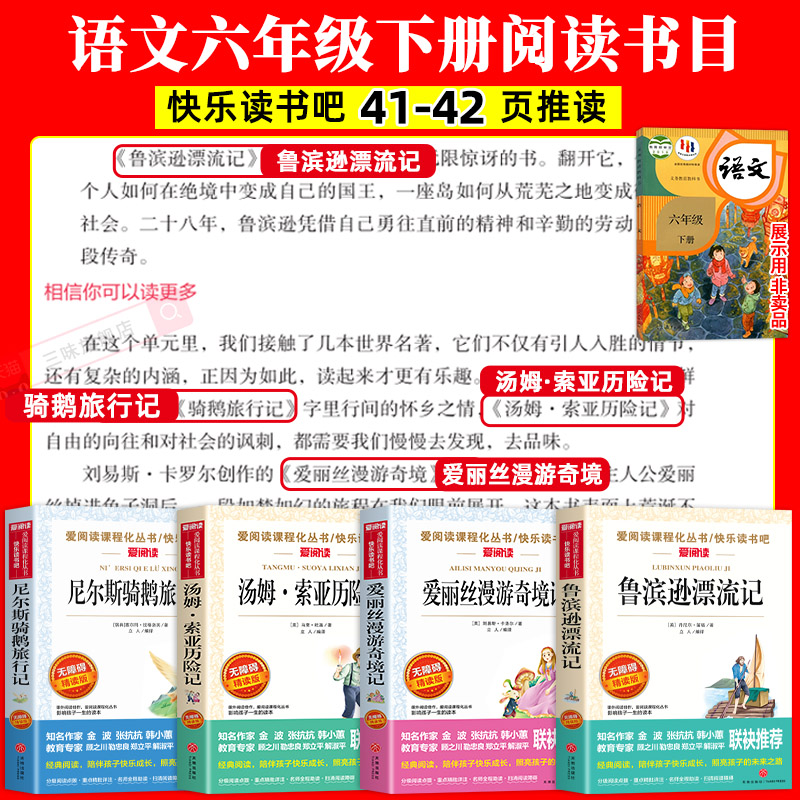 全套4册鲁滨逊漂流记六年级下册必读的课外书正版原著快乐读书吧6下书籍汤姆索亚历险记尼尔斯骑鹅旅行记爱丽丝漫游奇境孙阅读书目