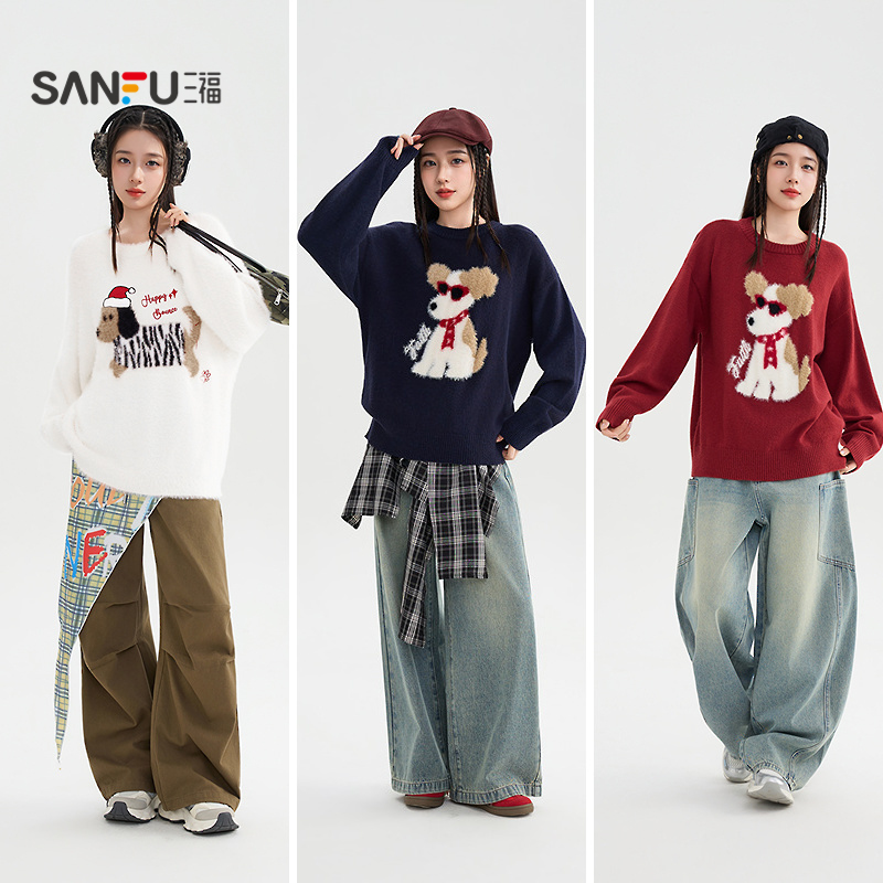 三福毛衣慵懒高级感2025新款冬季可爱毛绒小狗宽松上衣女装509727