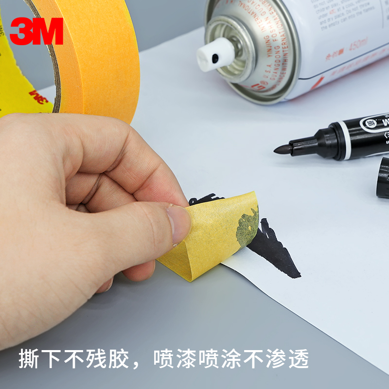 3m244美纹纸胶带烤漆专用喷涂遮蔽无痕耐高温黄色皱纹单面胶带