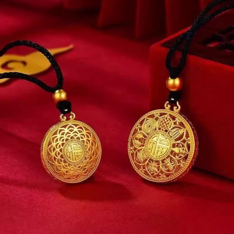 古法吉祥八宝罗盘转运项链黄金色正品福字莲花镂空男女款沙金吊坠