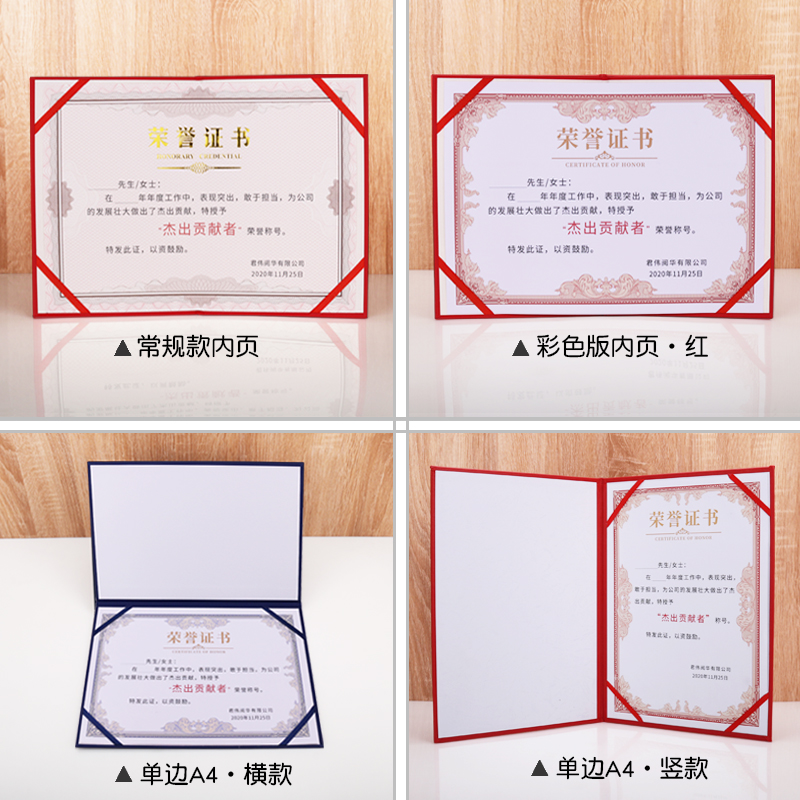 珠光红蓝荣誉证书红绒面外壳封皮定制作订做烫金12k8k优秀员工颁奖获奖大学生教师企业荣耀内芯设计打印包邮