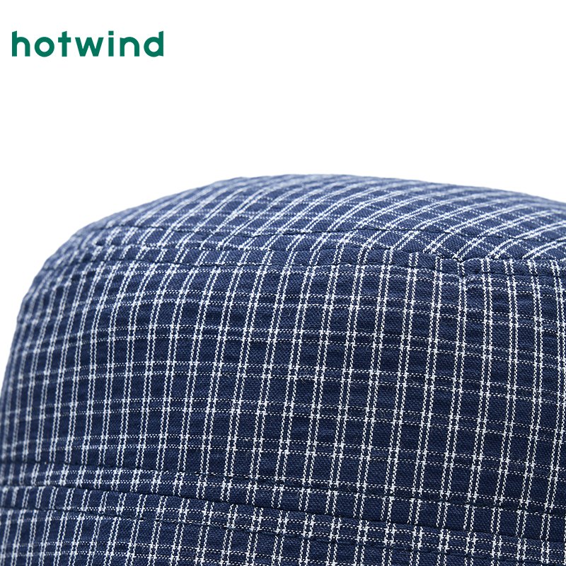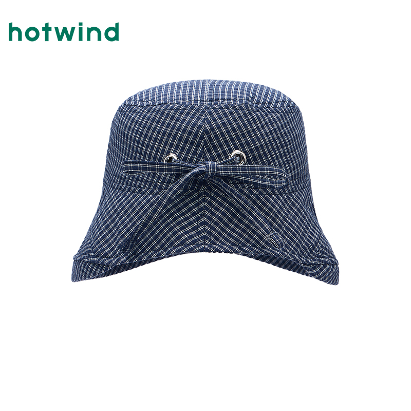 热风2025年秋季新款女士蓝色格纹格子系带盆帽纯棉质感复古风情
