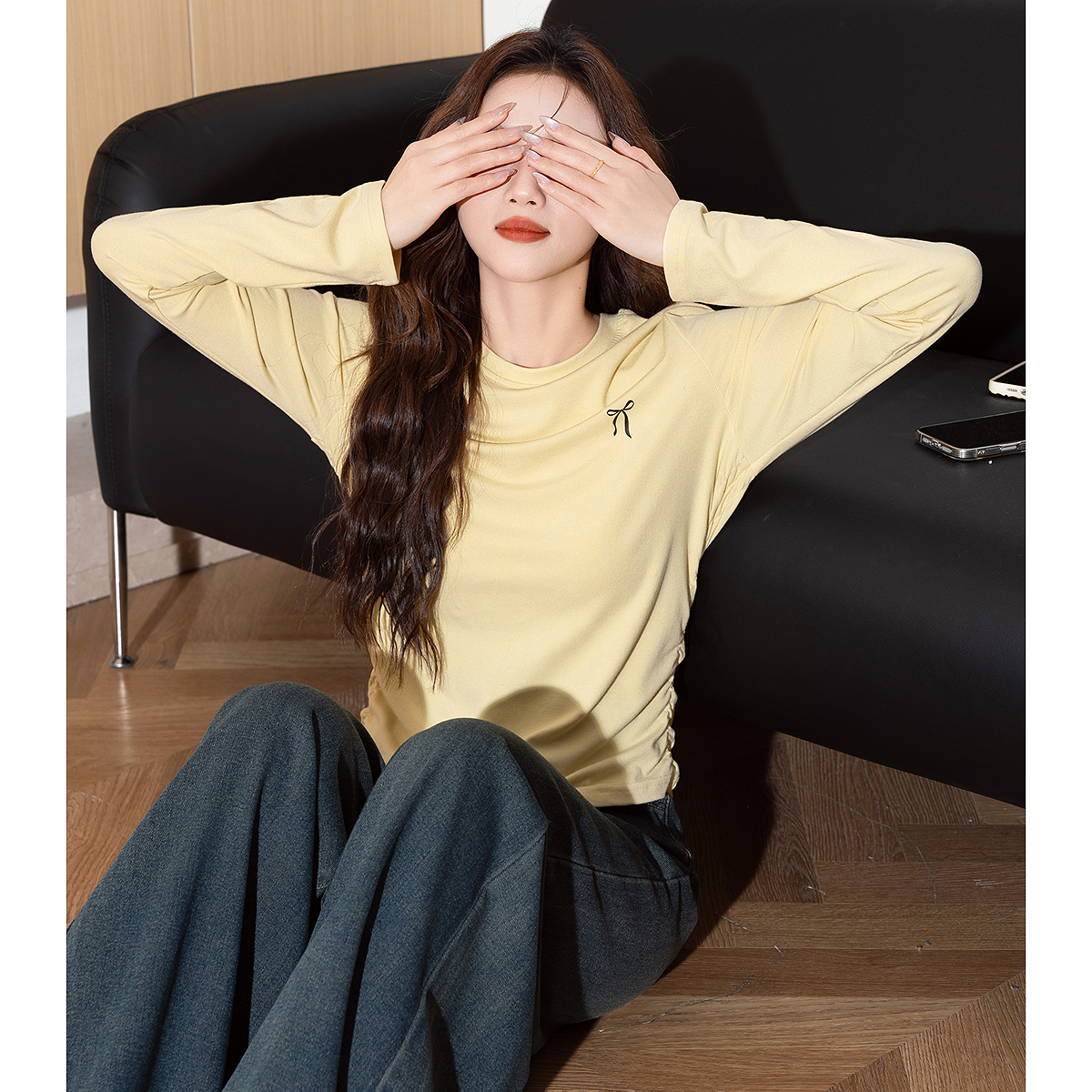 唐狮秋冬新款女长袖T恤蝴蝶结褶皱收腰修身气质打底衫内搭好看tu