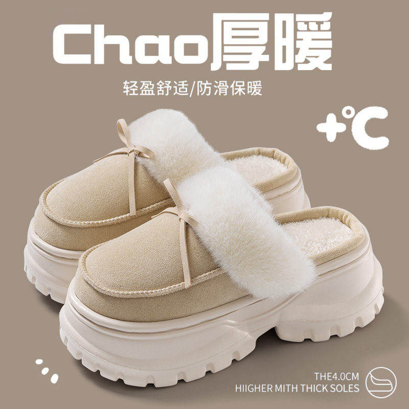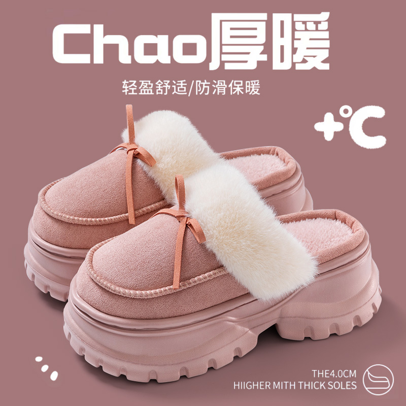 25新款棉拖女秋冬季加厚底室内保暖脚外穿防滑防寒蝴蝶结毛绒拖鞋