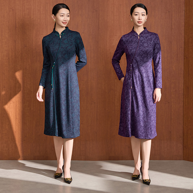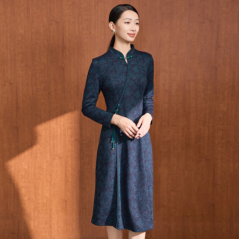 马天奴女装秋冬秋纯色提花立领连衣裙子新中式旗袍裙盘扣复古