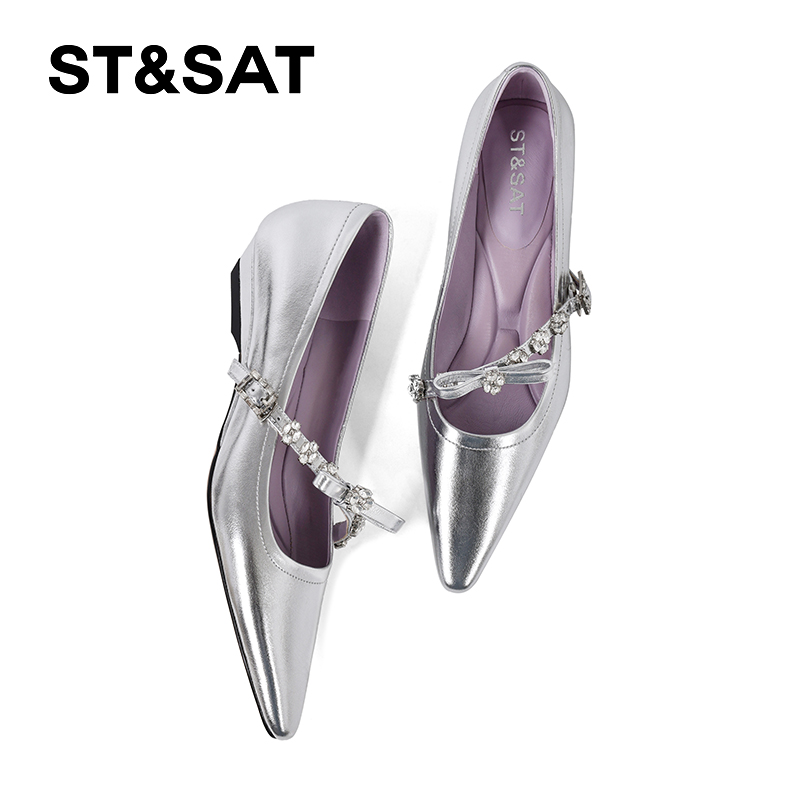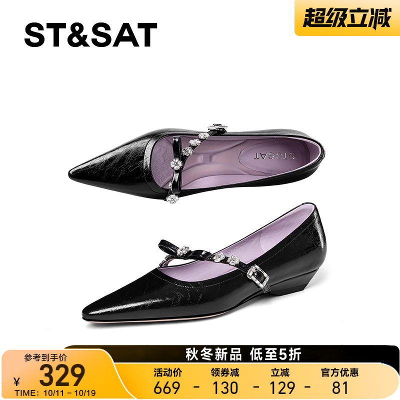 星期六2025春秋季尖头浅口单鞋女真皮水钻低跟法式玛丽珍气质女鞋
