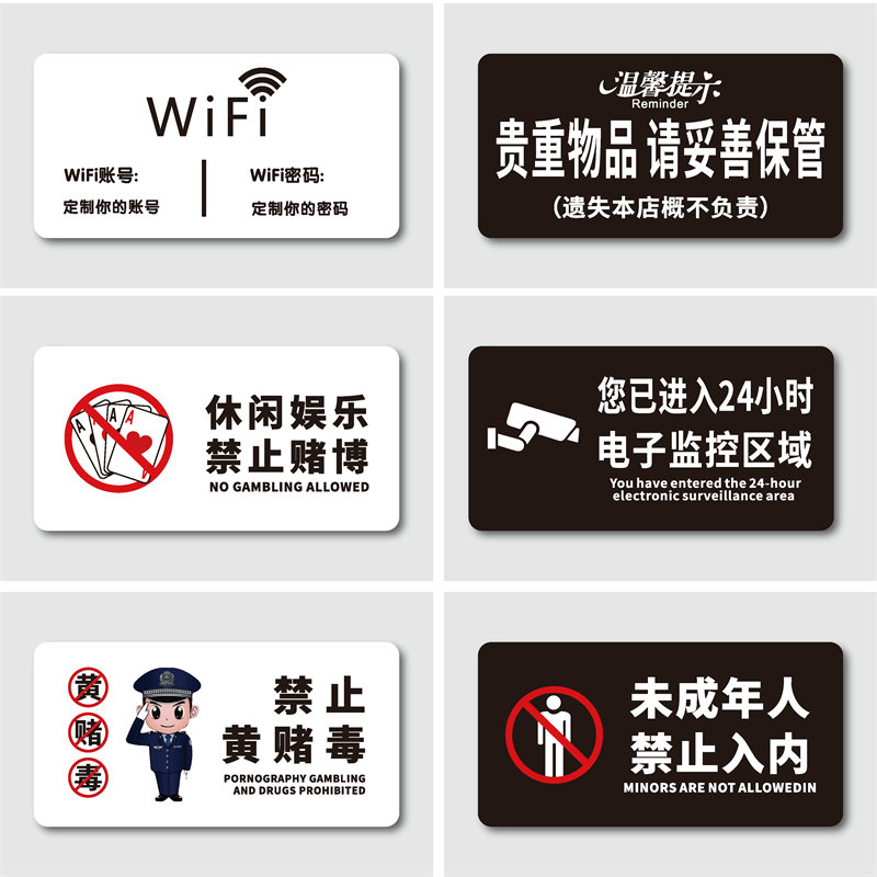 禁止黄赌毒标识牌定制棋牌室文明休闲棋牌娱乐严禁赌博警示牌无线WIFI账号密码提示牌未成年禁止入内指示牌贴