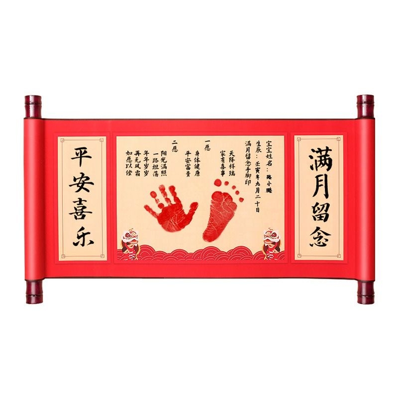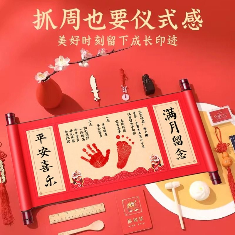周岁手足印宝宝纪念一岁一式感脚印满月百天礼物卷轴字画留念抓周