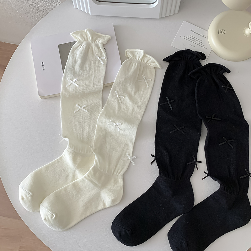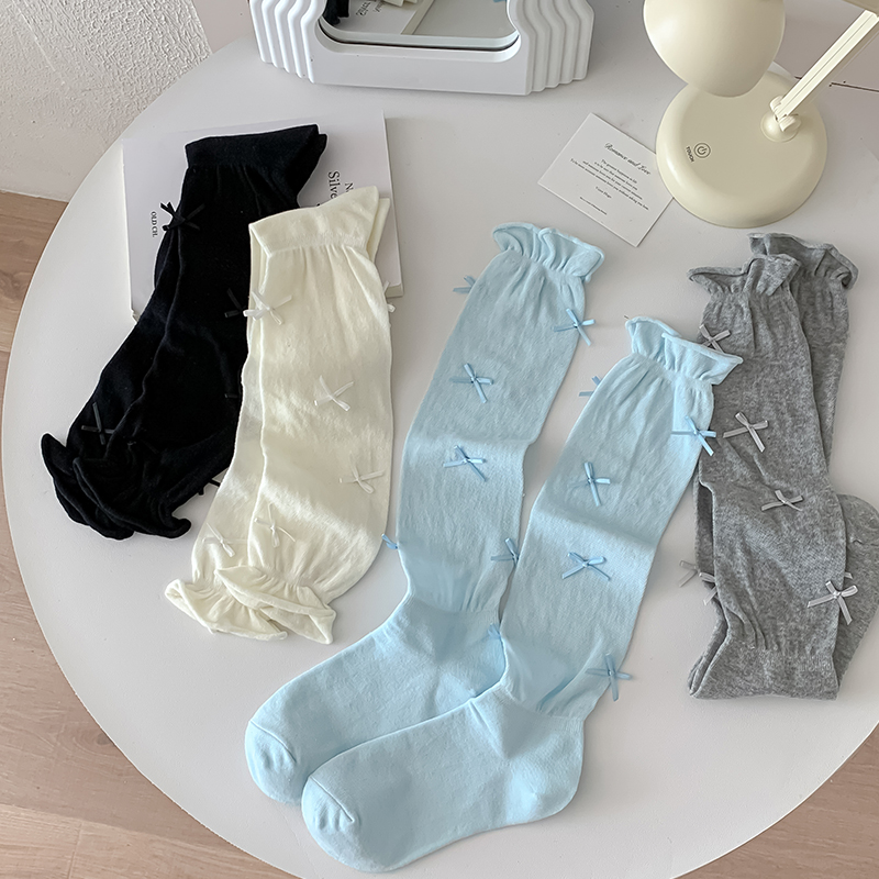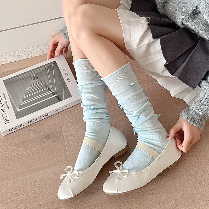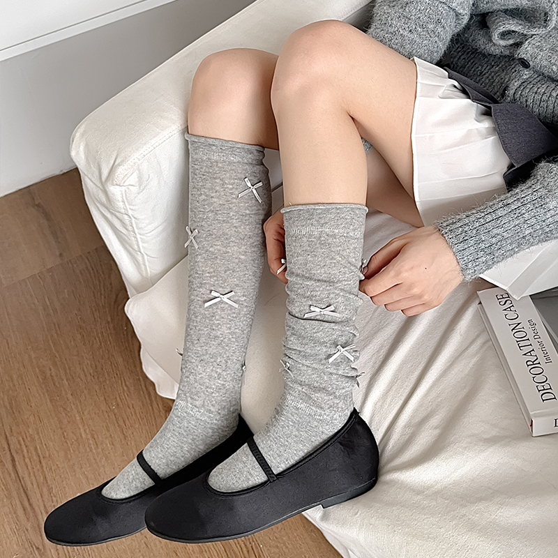 白色小腿堆堆袜女春秋蝴蝶结芭蕾风miu系女士袜子长筒款灰色高筒