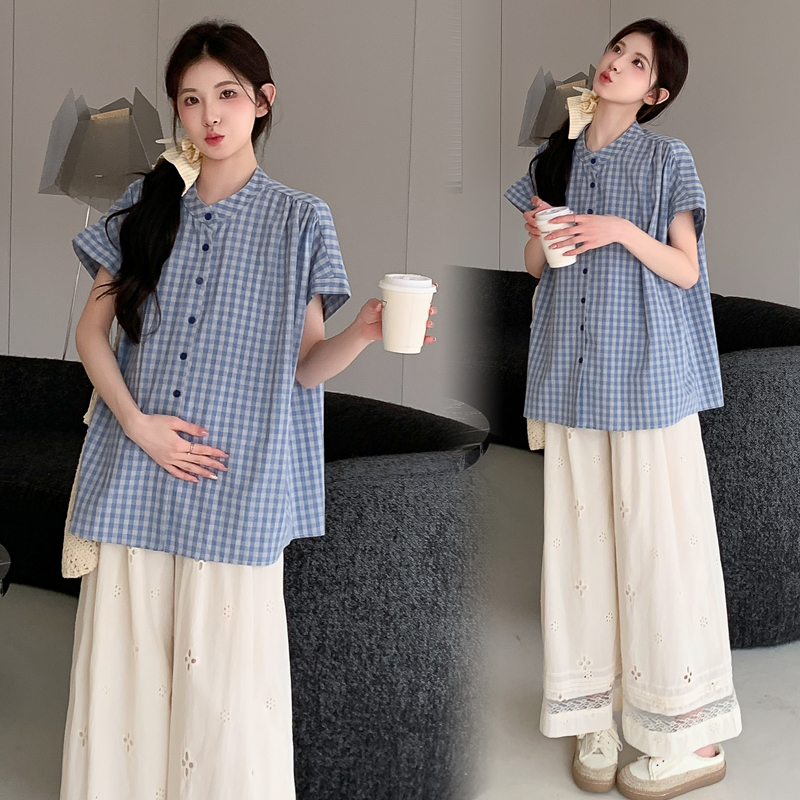 婧麒孕妇装女夏装时尚格子衬衫孕妇上衣休闲阔腿长裤孕期宽松套装